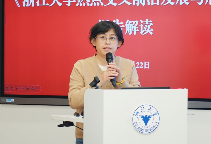 围绕“浙江大学热点交叉前沿现状分析”与“未来交叉前沿方向展望”两大维度,图书馆情报分析中心主任陈振英对《浙江大学热点交叉前沿发展与展望》报告进行了详细解读,系统梳理了学校在交叉前沿研究中的优势领域、薄弱环节与潜在突破方向,并进一步提出面向“十五五”的四项战略路径:强力驱动学科深度交叉融合、深挖传统优势学科增长潜能、前瞻布局探索性前沿领域、持续提升重大科学问题攻关能力等。随后,与会教师围绕热点前沿数据分析,工具应用场景等问题进行了交流与探讨。